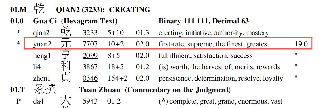 For 元 (yuan2), the First Witness is at Hexagram 01, Gua Ci (01.0):