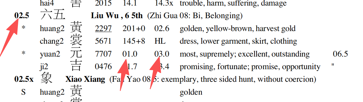 At Hexagram 02, Line 5. Notice that 02.5x (the Xiao Xiang for this line) also contains 元 — but it is a subsidiary entry (marked "S"), not part of the main chain.