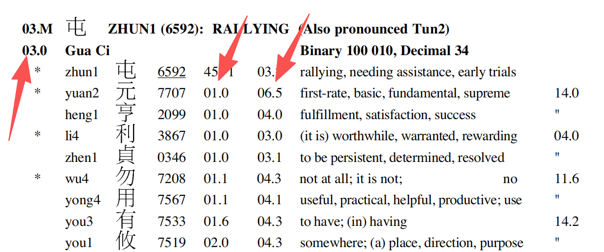 At Hexagram 02, Gua Ci, we see 元 again. The reference column says 01.0 — this points back to the First Witness (where the core definition is). The next column says 02.5.
