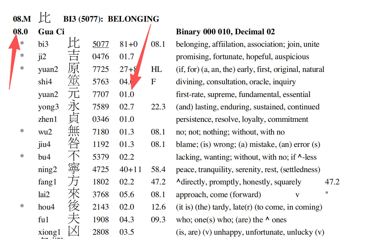 At Hexagram 08, Gua Ci. Notice another character: 原 (yuan2, Mathews 7725) with stats 27+8 and reference HL. This is a different character — same pronunciation but different Mathews number. HL means Hapax Legomenon: it appears only once in the entire text.